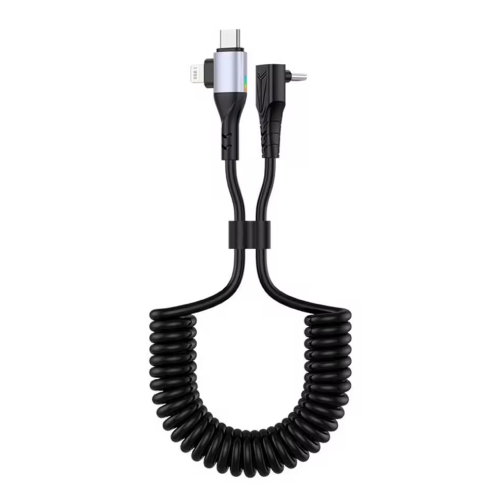 • Gekrulde zwarte USB-C naar Lightning en USB-C kabel